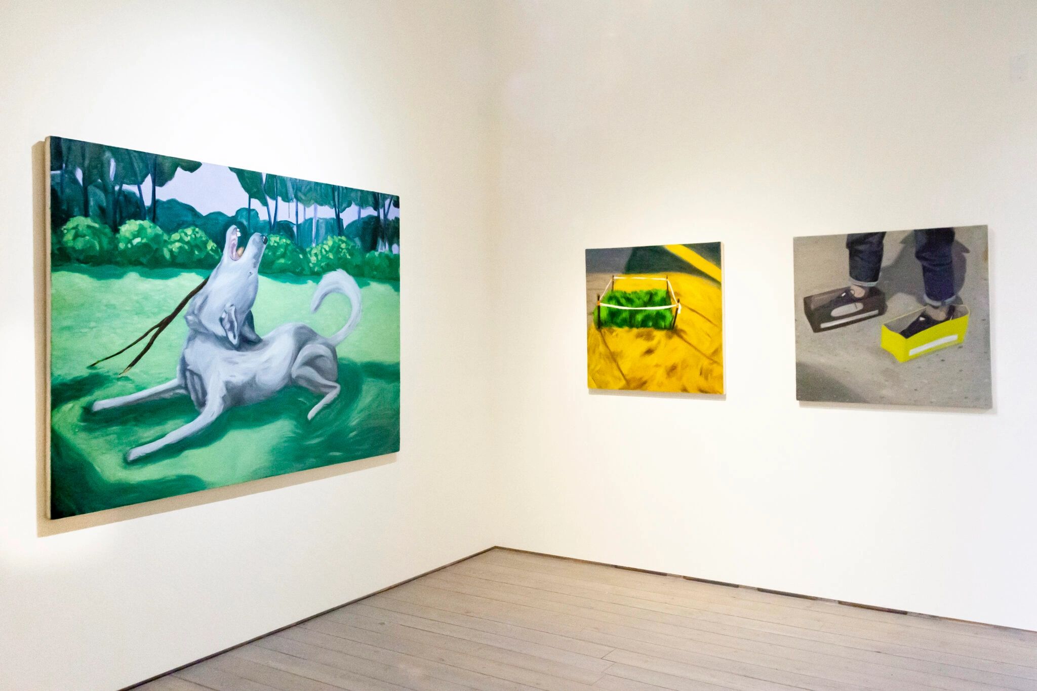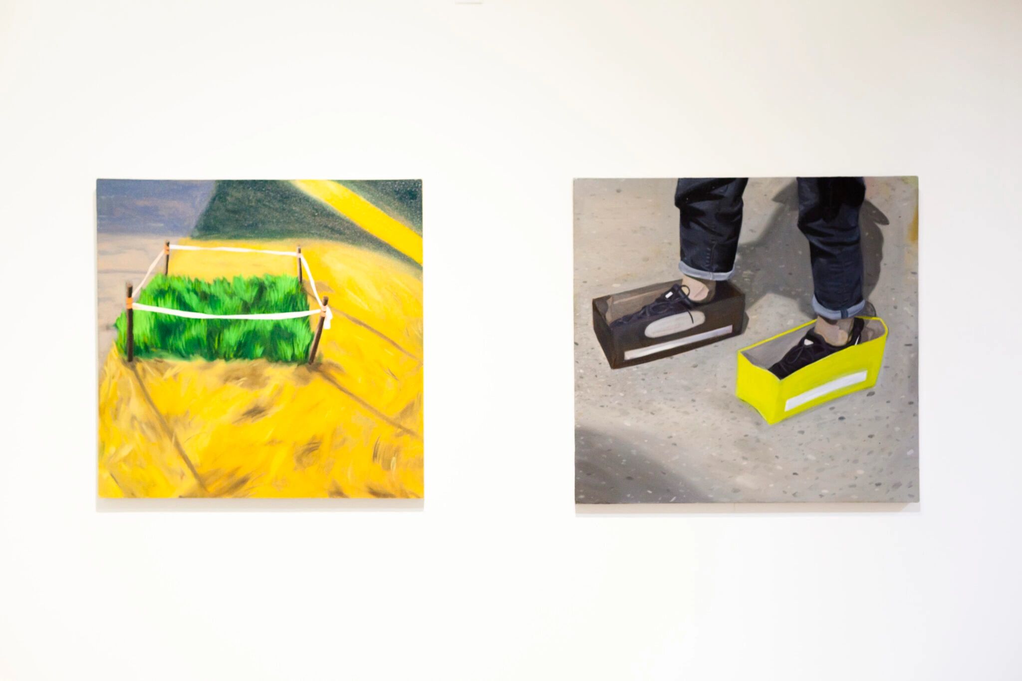 INSTALL VIEW OF SURFACE OBSTACLE I & II, 2023, OIL ON CANVAS, 31 X 34", TELEPHONE GALLERY, SPRING 2023