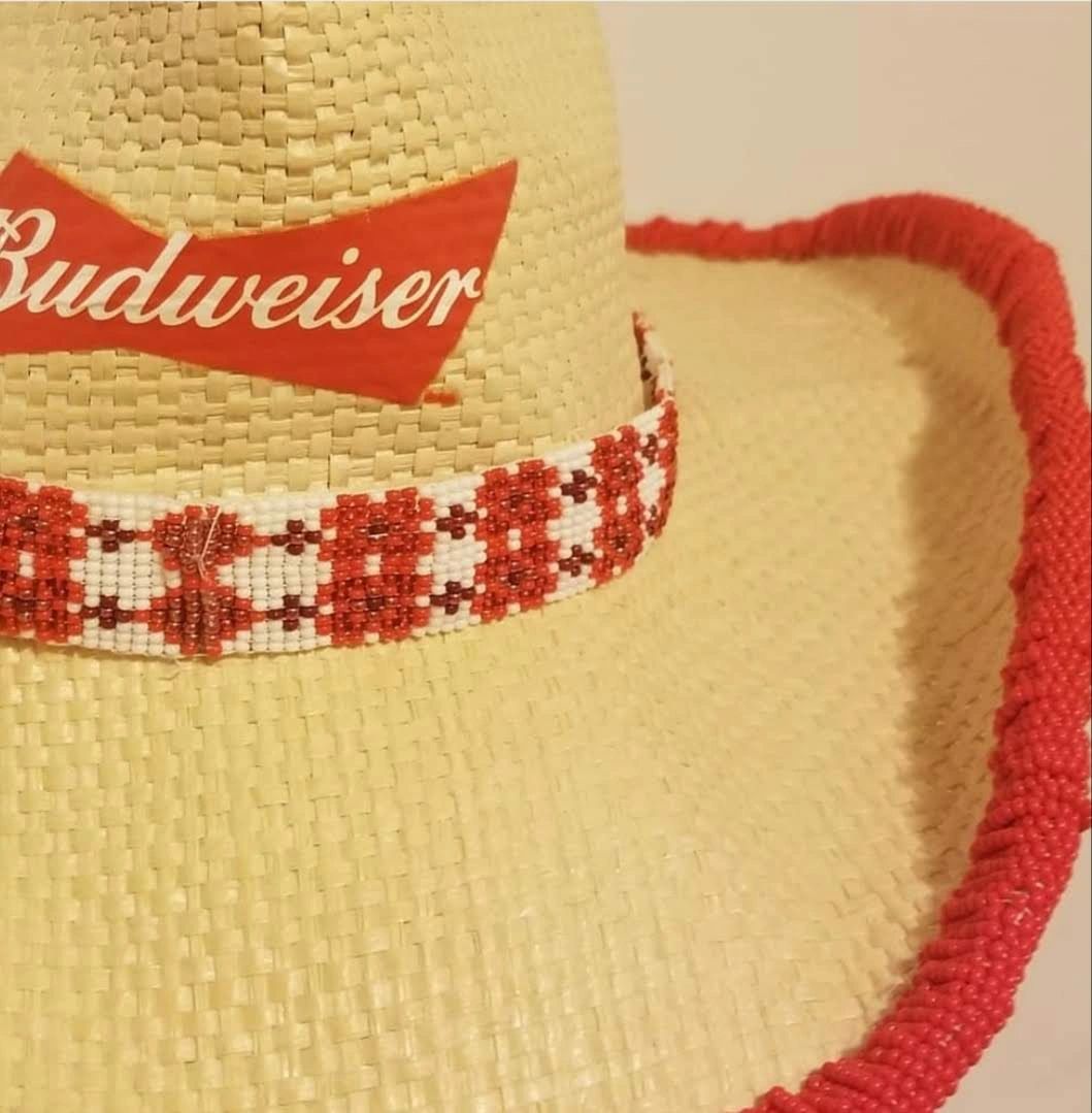 BUDWEISER WOVEN STRAW COWBOY HAT, SEED BEADS